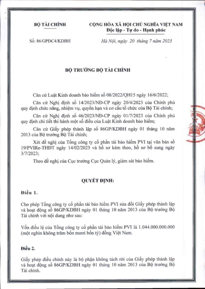PVI Reinsurance Joint Stock Corporation has officially received approval from the Ministry of Finance to increase its charter capital to VND 1,044 billion per License No. 86/GPĐC4/KDBH issued on 20/07/2023.