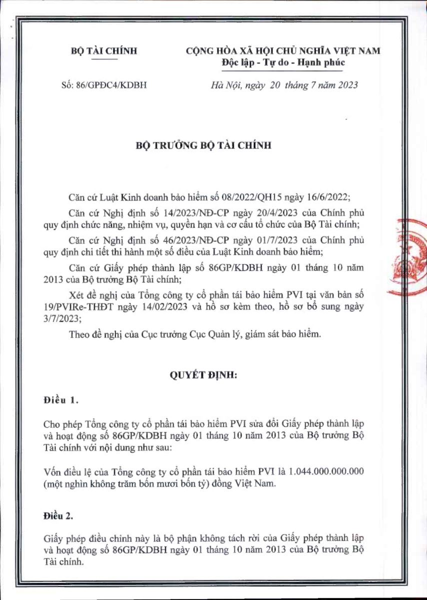 Tổng Công ty Cổ phần Tái bảo hiểm PVI đã chính thức được Bộ Tài Chính chấp thuận tăng vốn điều lệ của công ty lên 1.044 tỷ đồng theo Giấy phép điều chỉnh số 86/GPĐC4/KDBH cấp ngày 20/07/2023.