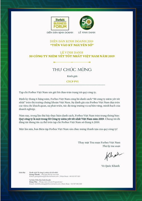 THƯ CHÚC MỪNG CỦA FORBES VIỆT NAM GỬI ĐẾN PVI