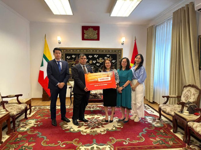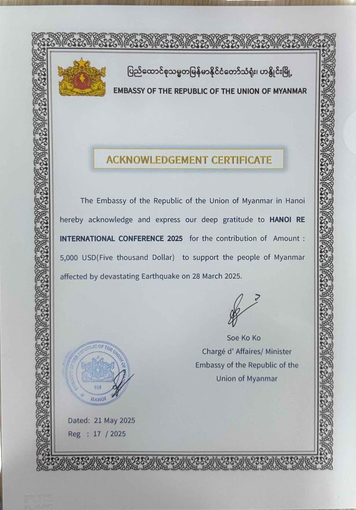 Ngày 21/5/2025, đại diện Hanoi Re dẫn đầu là Bà Lê Thị Thúy – Phó Tổng Giám đốc và đại diện các khách mời HRIC 2025 – Bà Lê Thuận – Quản lý cấp cao, Trưởng phòng Tái Bảo hiểm Công ty TNHH Bảo hiểm Samsung Vina đã tới và trao tặng trực tiếp số tiền 5.000 USD tới Đại sứ quán Myanmar tại Hà Nội. Thay mặt nhân dân Myanmar, Đại sứ đặc mệnh toàn quyền Myanmar Ngài Soe Ko Ko bày tỏ lòng biết ơn sâu sắc tới các doanh nghiệp bảo hiểm/tái bảo hiểm vì tấm lòng nhân ái và khoản hỗ trợ 5.000 USD để hỗ trợ công tác cứu trợ và phục hồi cho người dân Myanmar sau trận động đất tàn khốc ngày 28/03/2025.