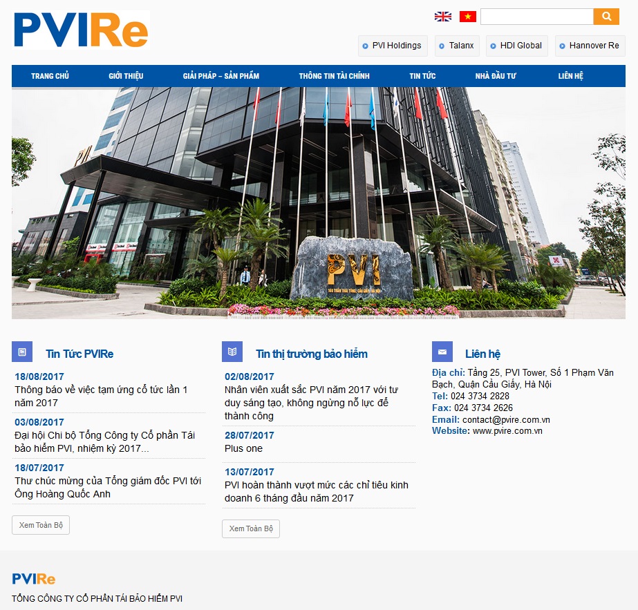 Nhằm phục vụ tốt hơn nhu cầu thông tin và quảng bá hình ảnh, thương hiệu của Tổng Công ty cổ phần Tái bảo hiểm PVI (PVIRe) tới khách hàng, đối tác trong và ngoài nước, kể từ ngày 21/08/2017, PVIRe chính thức nâng cấp và thay đổi giao diện website http://www.pvire.com.vn