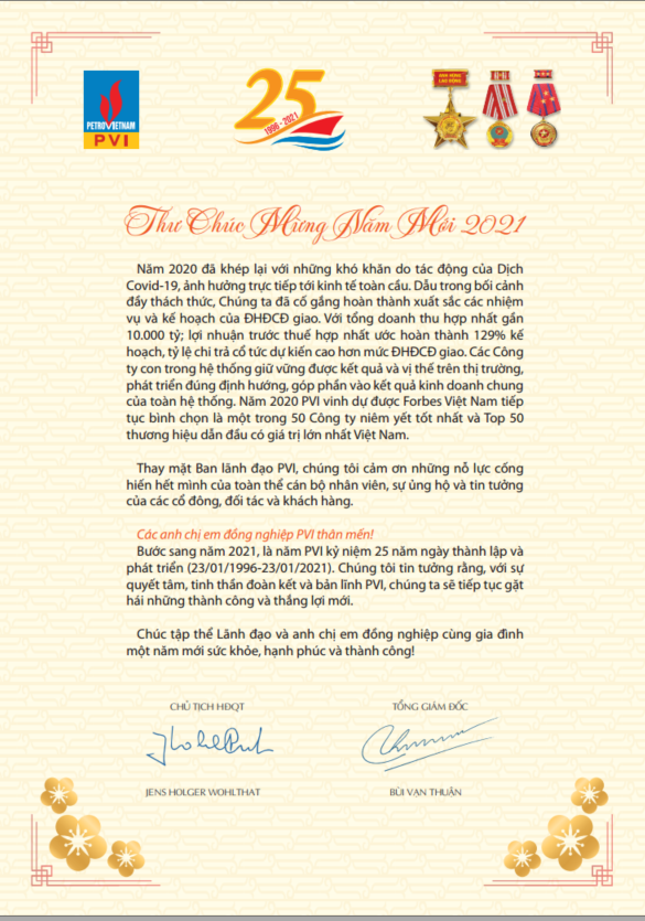 Nhân dịp năm mới 2021, Chủ tịch Hội đồng Quản trị và Tổng giám đốc PVI đã gửi đến cán bộ nhân viên PVI, các đối tác, khách hàng, nhà đầu tư những lời chúc tốt đẹp nhất. Dưới đây là toàn văn thư chúc mừng.
