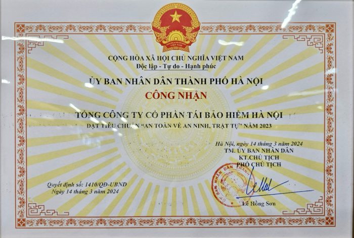 Chiều ngày 17/4/2024, Tổng Công ty CP Tái bảo hiểm Hà Nội (Hanoi Re) đã vinh dự được đón nhận Bằng khen và Quyết định của UBND TP Hà Nội về việc: Công nhận cơ quan, doanh nghiệp, cơ sở giáo dục đạt tiêu chuẩn “An toàn về an ninh, trật tự năm 2023”, cùng vinh dự đón nhận bằng khen với Hanoi Re là 380 cơ quan, doanh nghiệp, CSGD khác đang hoạt động trên địa bàn thành phố.